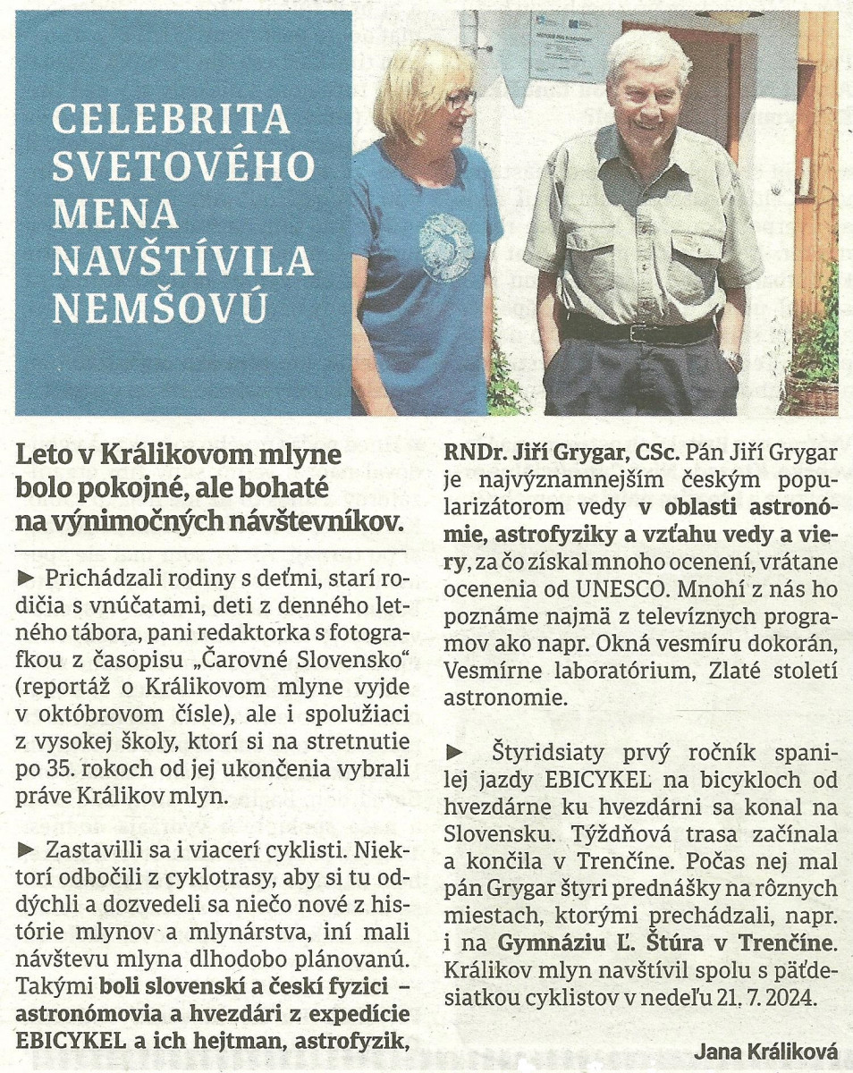 Králikovho mlyna v letných mesiacoch, od 9. 7. do 10. 9. 2021.